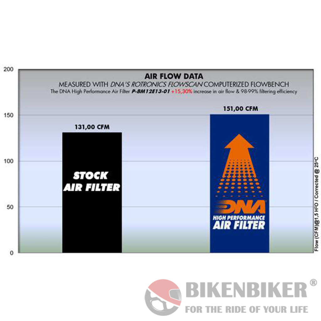 - DNA Fcd air filter flow: 151.00 CFM (Cubic feet per minute) @1,5"H2O corrected @ 25degrees Celsius.
