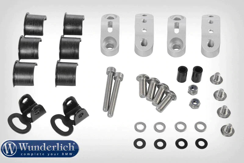 When mounting our Wunderlich tank protection bars, we must use the two original mounting points of BMW 's auxiliary lamps, the result is that the points are no more available. This kit replaces the original holding bracket. Thereby the fastening points are "doubled“ and the original additional lamps can be mounted again at the same place.