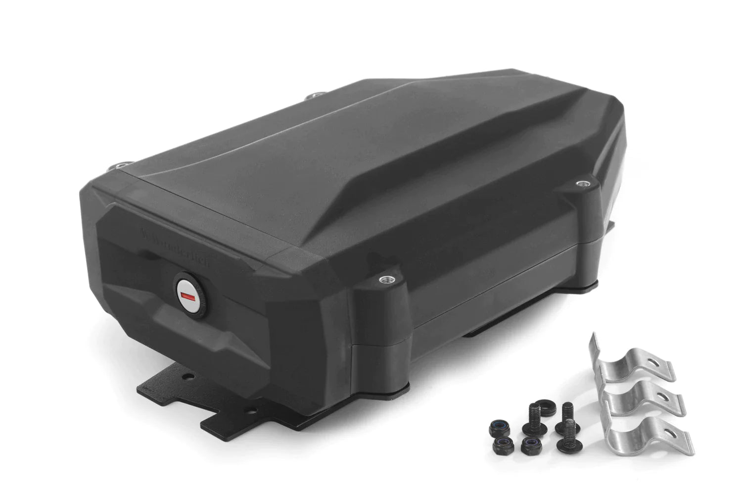 Our tailored tool box offers additional storage space for all kinds of helpful bits and pieces, so it integrates perfectly into the niche between the left case carrier and the rear wheel. The functional, robust box is equipped with four threaded inserts and attaches securely to the series standard case carrier via a bracket and matching clips. It can be opened and closed from the tail - even once the cases are mounted - for easy access any time. The cover is secured against loss. The box made of high-quality plastic is waterproof and extremely robust. We deliver this together with the bracket.