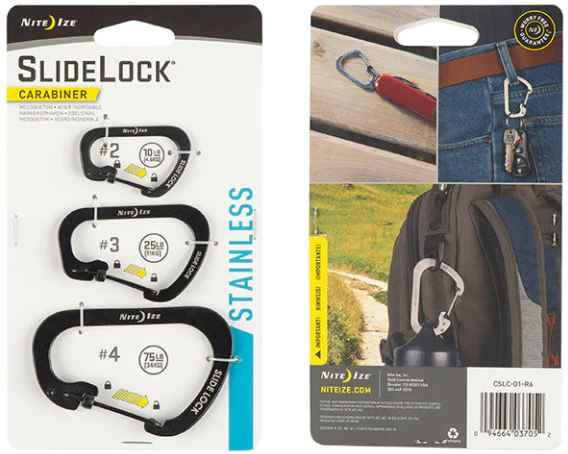 At Nite Ize, we believe no product is too small or basic to be improved. Exhibit A: the classic utility carabiner. We took a hard look at this ubiquitous device and saw two good opportunities to make it more efficient. We designed an innovative slide-to-lock feature that securely locks the gate with a simple push and slide movement, and unlocks when you want it to just as easily. Then, instead of a bulky tubular construction, we designed a cross sectioned, rectangular stainless steel body that's durable, low profile, and slim; it feeds more easily through smaller openings and rests flat in pockets. Available in four sizes: #6 (to tackle the largest items), #4 (perfect for attaching to a belt loop or backpack to carry larger items), #3, and #2 (for carrying smaller items like keys, and attaching to zipper pulls).