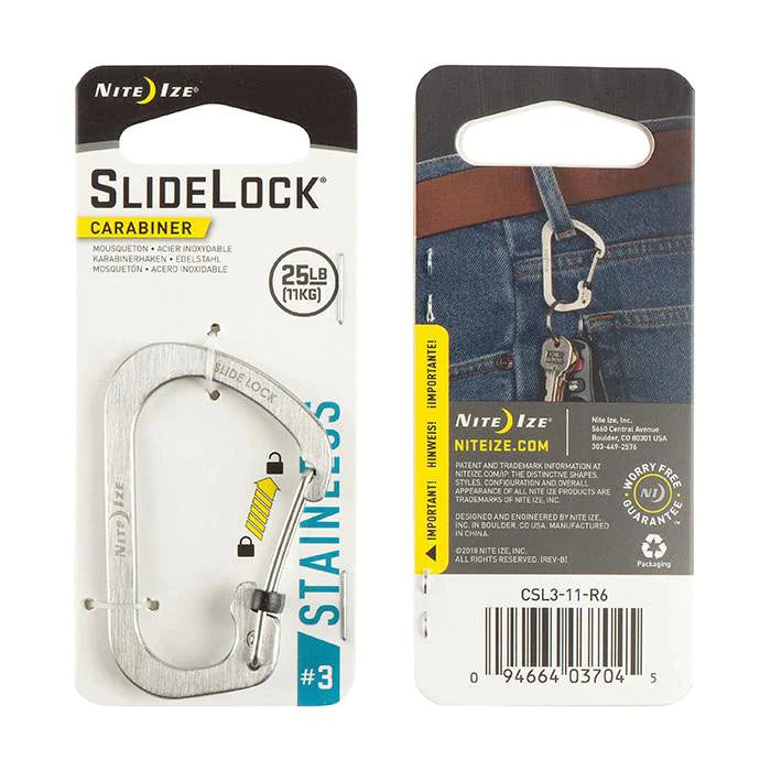 At Nite Ize, we believe no product is too small or basic to be improved. Exhibit A: the classic utility carabiner. We took a hard look at this ubiquitous device and saw two good opportunities to make it more efficient. We designed an innovative slide-to-lock feature that securely locks the gate with a simple push and slide movement, and unlocks when you want it to just as easily. Then, instead of a bulky tubular construction, we designed a cross sectioned, rectangular stainless steel body that's durable, low profile, and slim; it feeds more easily through smaller openings and rests flat in pockets. Available in four sizes: #6 (to tackle the largest items), #4 (perfect for attaching to a belt loop or backpack to carry larger items), #3, and #2 (for carrying smaller items like keys, and attaching to zipper pulls).