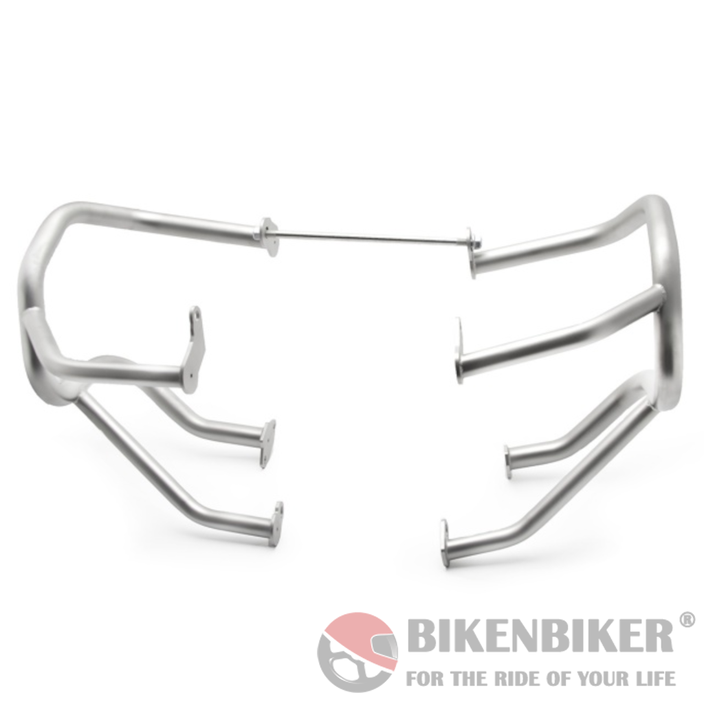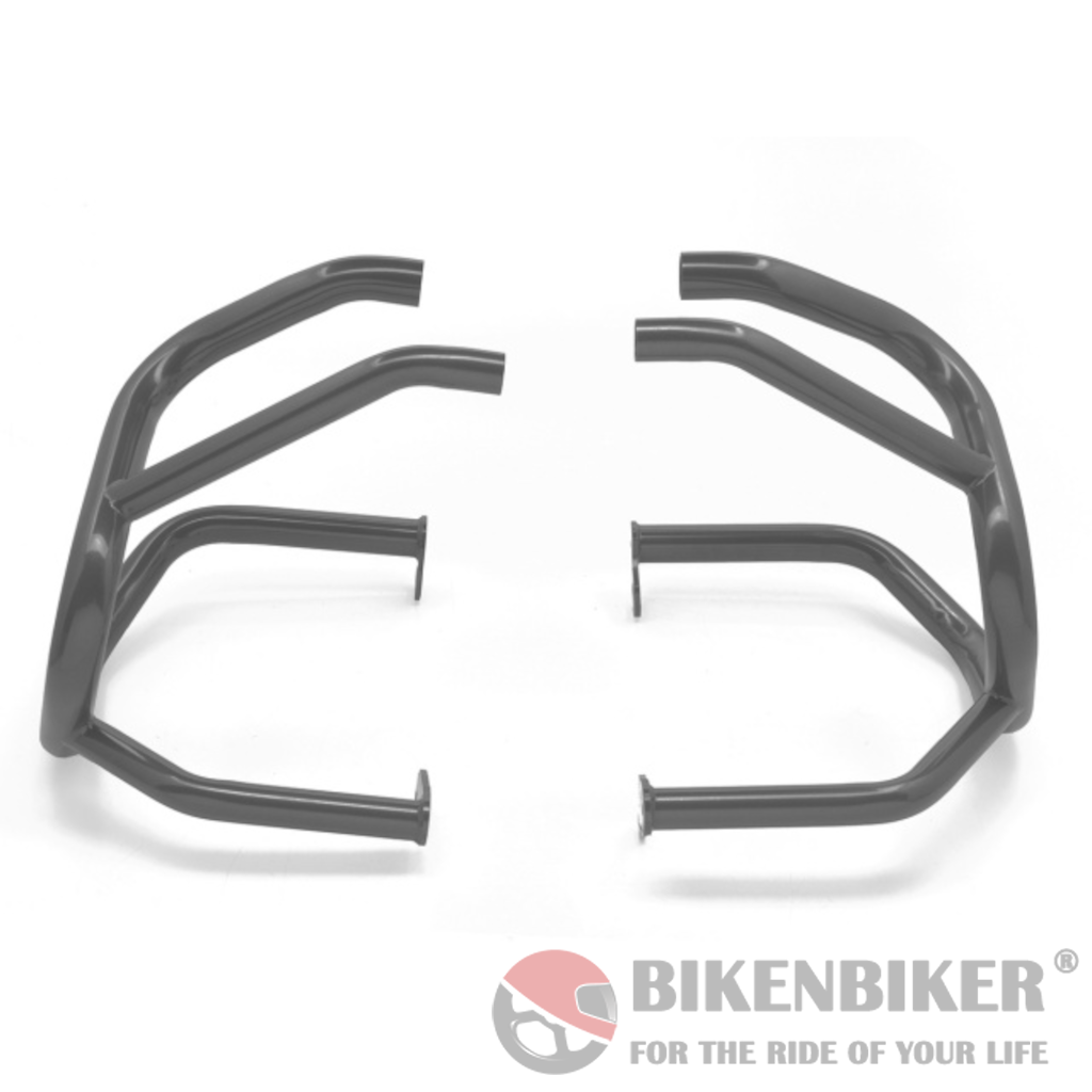 The top of the bars are secured in a total of three locations per side. The front mount is the only one on the market designed to utilize two bolts per side to increase the ability to distribute the load of any impact. The rear is held with a custom machined through-bolt that replaces the engine mount hardware -- increasing strength of the bars up to 25%. AltRider offers one of only a few designs that utilize a custom machined through-bolt. There are no plastic spacers to break upon impact. This creates an incredibly strong design that distributes any impact evenly throughout the bars, and also makes a solid foundation for upper crash bars.