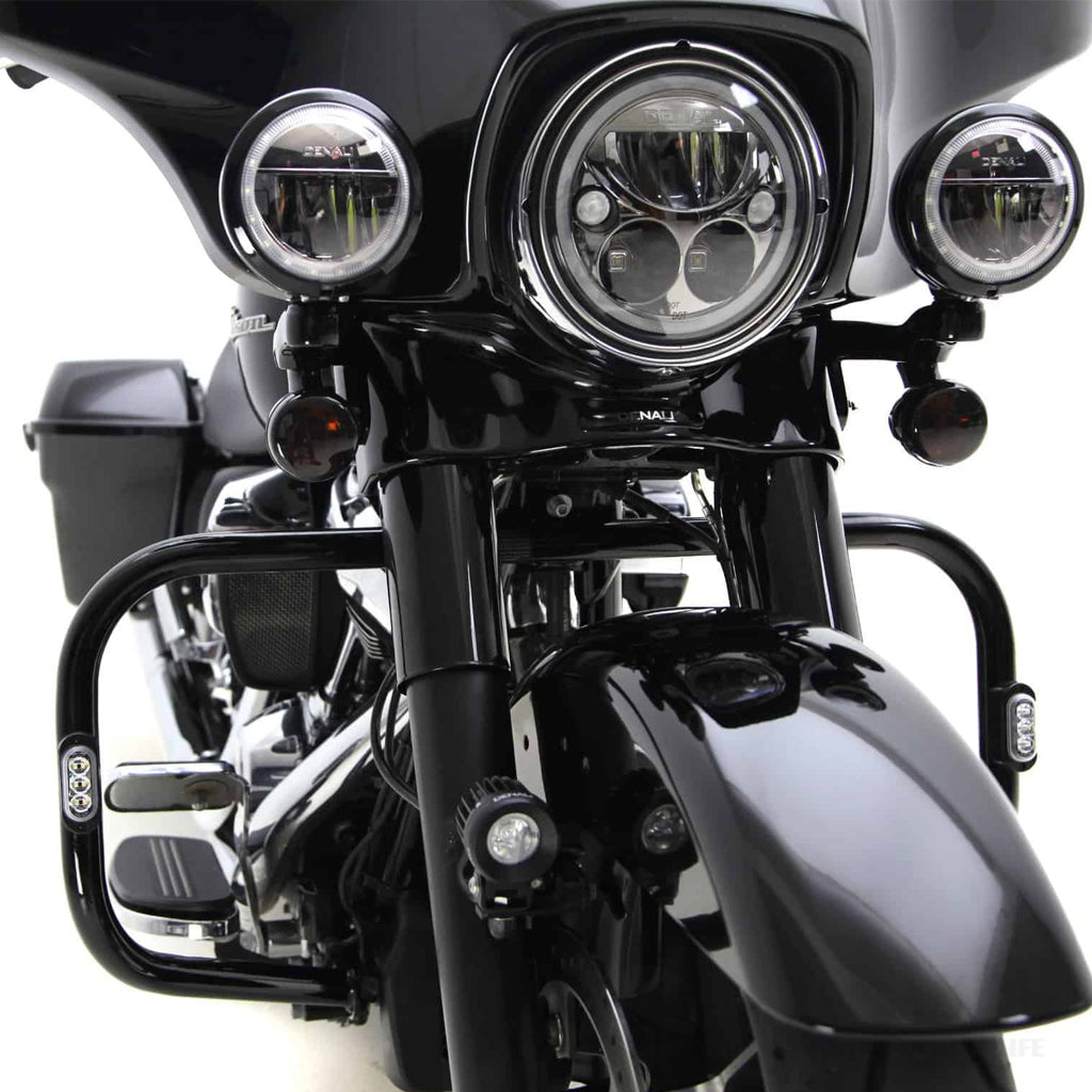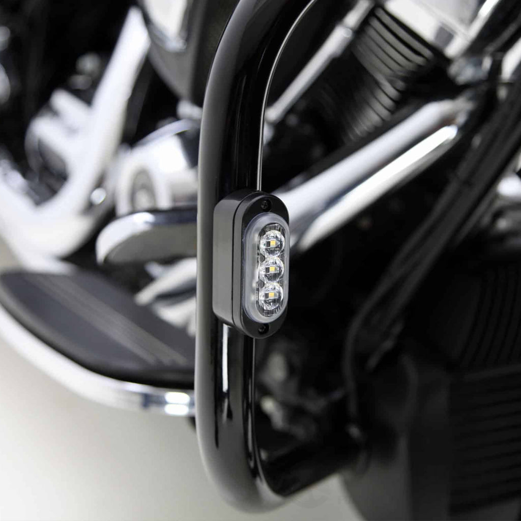 The mounting adapter is fixed to the bar with 3M VHB foam double-stick tape creating the illusions that the T3 Signal Pods were built into the bar right from the factory. A channel allows the wire to exit the housing, but you can also run the wire inside the bar for a super custom look. These adapters fit all Harley-Davidson engine guards and all aftermarket engine guards measuring 1.25 inches in diameter. Click here to learn more about our groundbreaking T3 Modular Switchback Signal Pods.