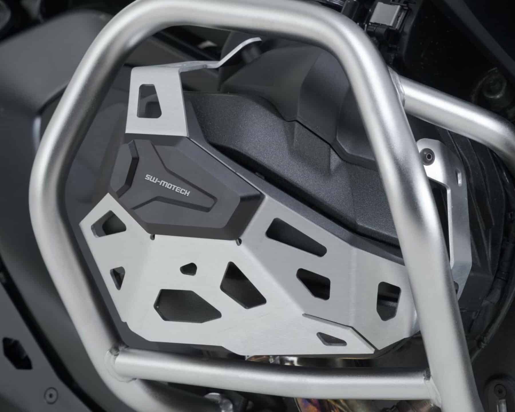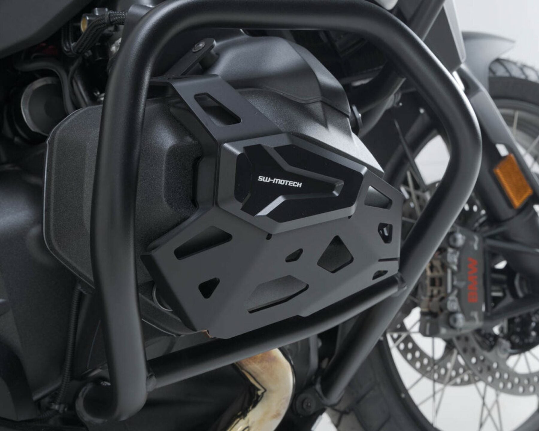 SW-Motech brings you the Cylinder Guard for BMW R1300GS. With a laser-cut aluminum mounting bracket and a CNC-milled anodized aluminum slider pad, this guard adapts to the shape of the valve cover and protects the boxer valve cover against falls and slides. There is even a rubber damper on the inside to help absorb any impacts. With just three screws per side, the protector is easily mounted onto existing attachment points.