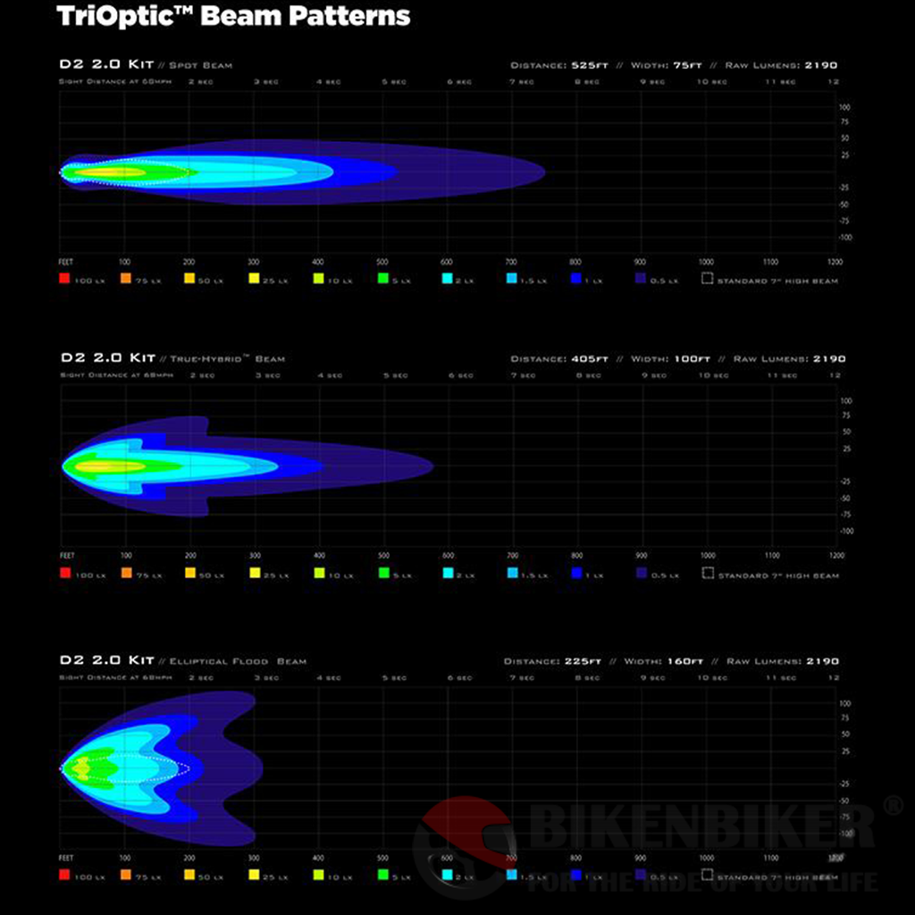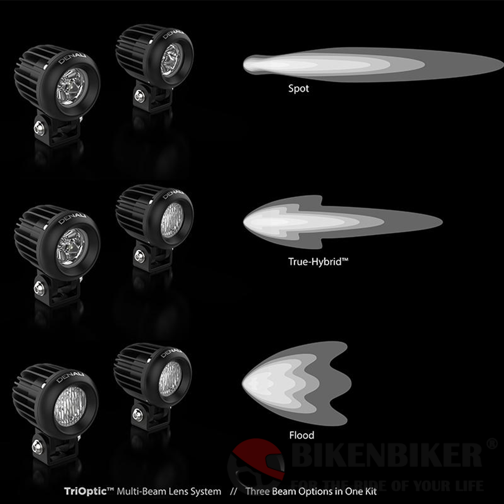 The DENALI D2 2.0 LED TriOptic™ LED light kit with DataDim technology produces a remarkable amount of light in a very compact package that is perfect for all styles of riding and types of motorcycles. With a powerful 10-watt Cree LED, the DENALI D2 casts a powerful beam 525ft down the road.