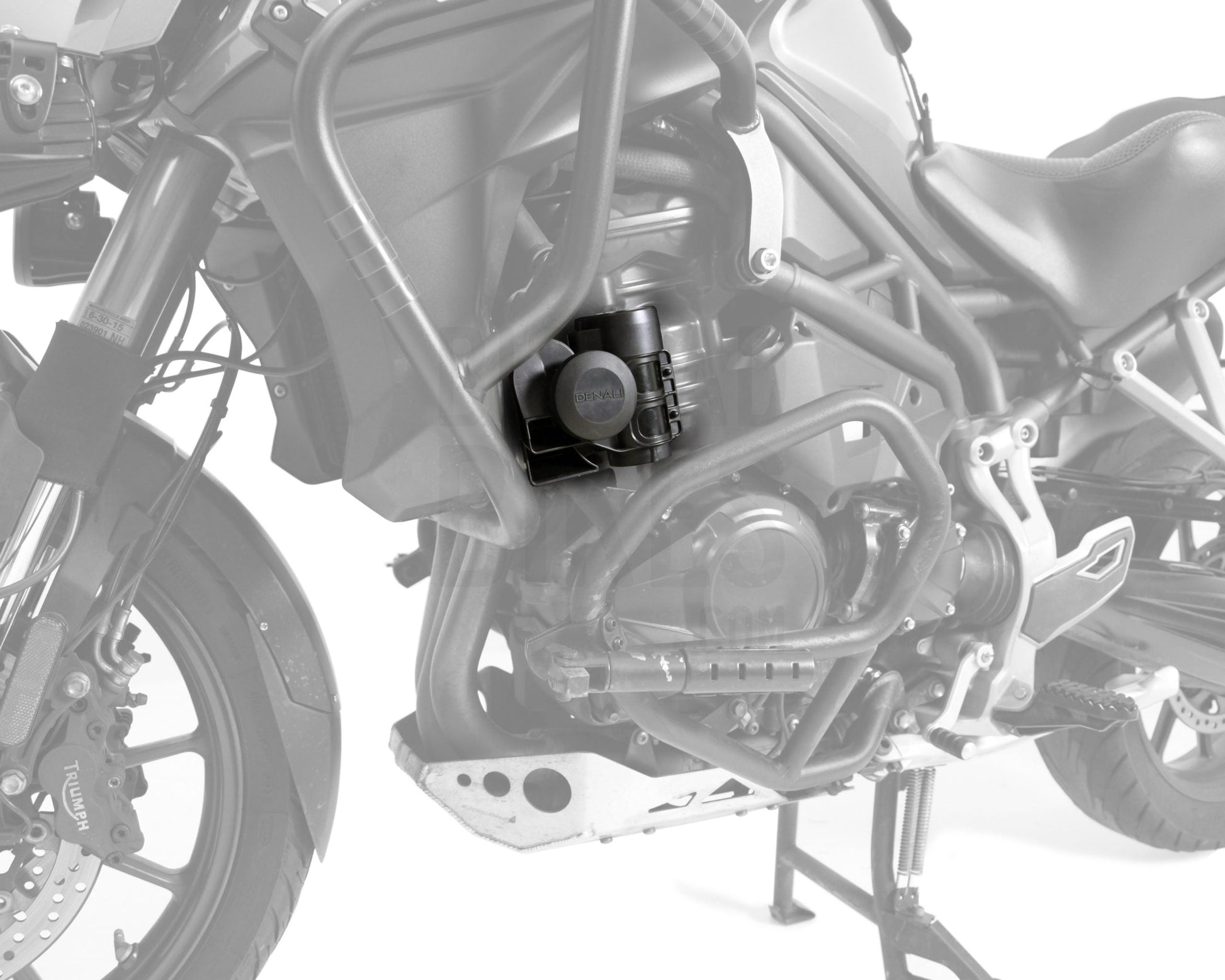 Denali brings you the Tiger Explorer XC specific mounting for the Denali Soundbomb Dual Tone Air Horn. This bracket mounts the horn conveniently by the side of the engine, keeping it as low profile as possible.