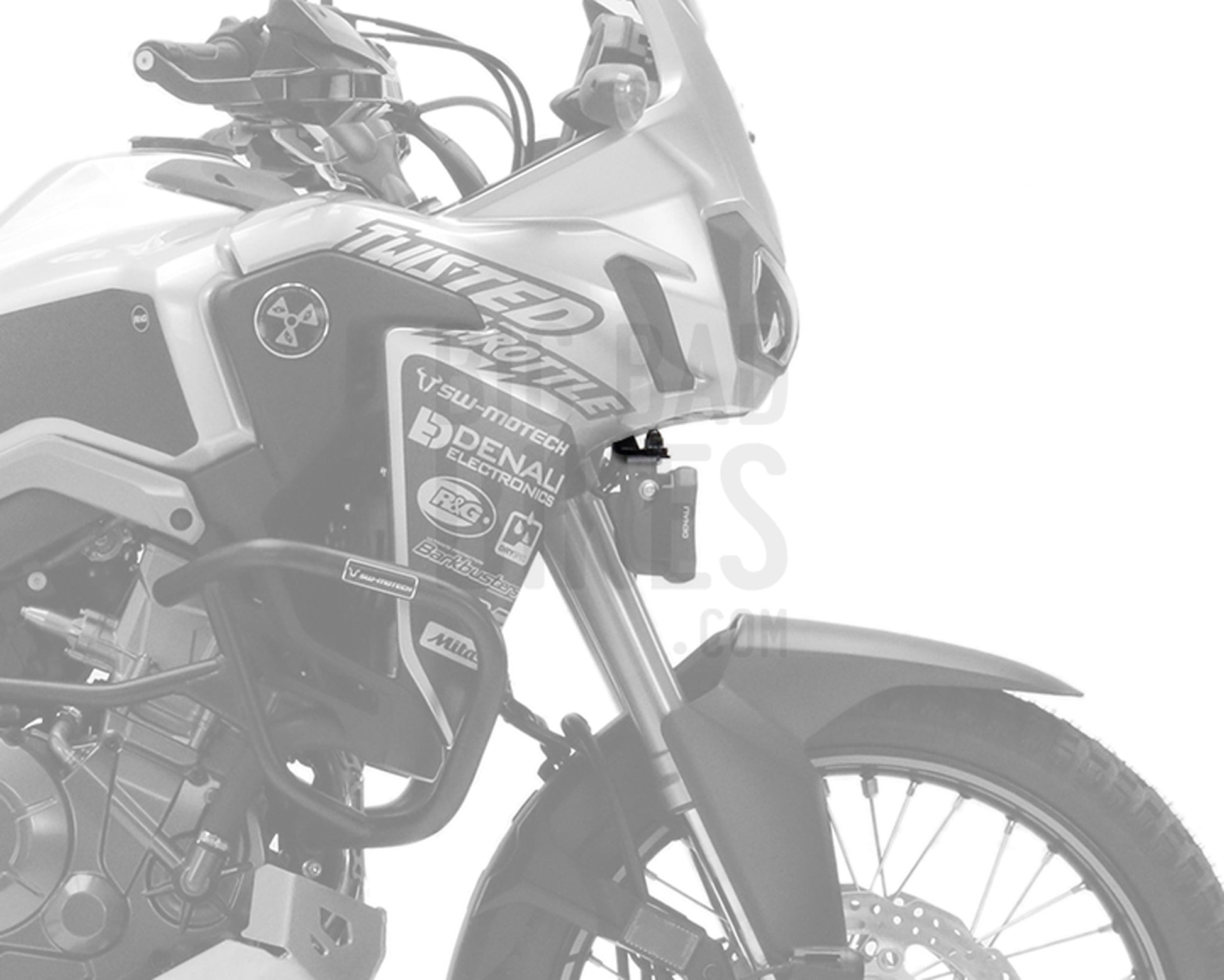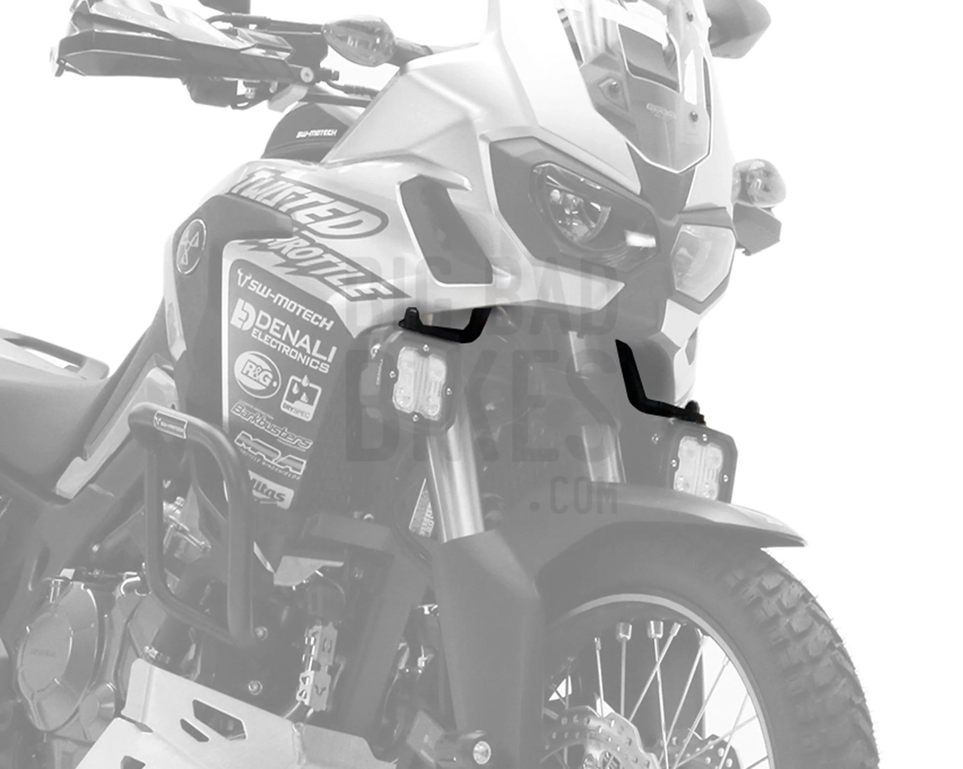 Denali brings you auxiliary light mounts for Honda Africa Twin. These mounts are designed for all Denali LED light kits, but will accommodate most other LEDs. They are made from robust laser cut steel, and powder coated black to blend into the background. They install onto existing mounting points and require no modification in order to install.