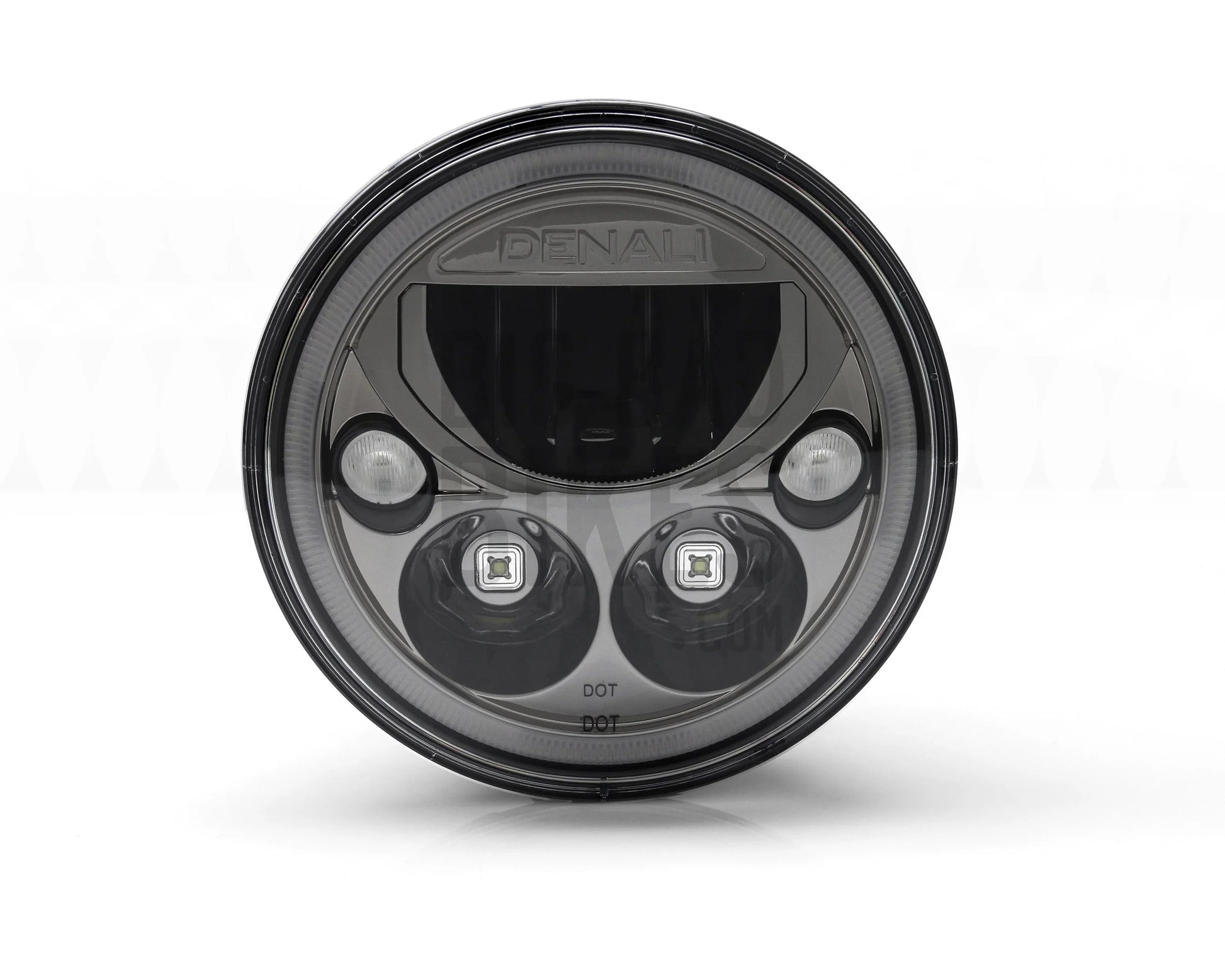 The DENALI DOT approved M7 LED Headlight module is a direct plug and play replacement to the original 7 inch sealed beam headlight on your motorcycle. It features a super wide low beam, piercing high beam, and halo day time running light. Drop this headlight module inside your existing headlight housing to throw a blazing beam of light three times further than your stock halogen headlight and twice as far as a stock LED headlight. The unique design and black chrome finish of the optics will give your bike that modern custom look while also increasing your visibility to oncoming traffic even during daylight.