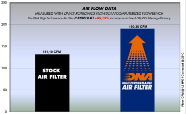 - DNA Fcd air filter flow: 190.30 CFM(Cubic feet per minute) @1,5"H2O corrected @ 25degrees Celsius.