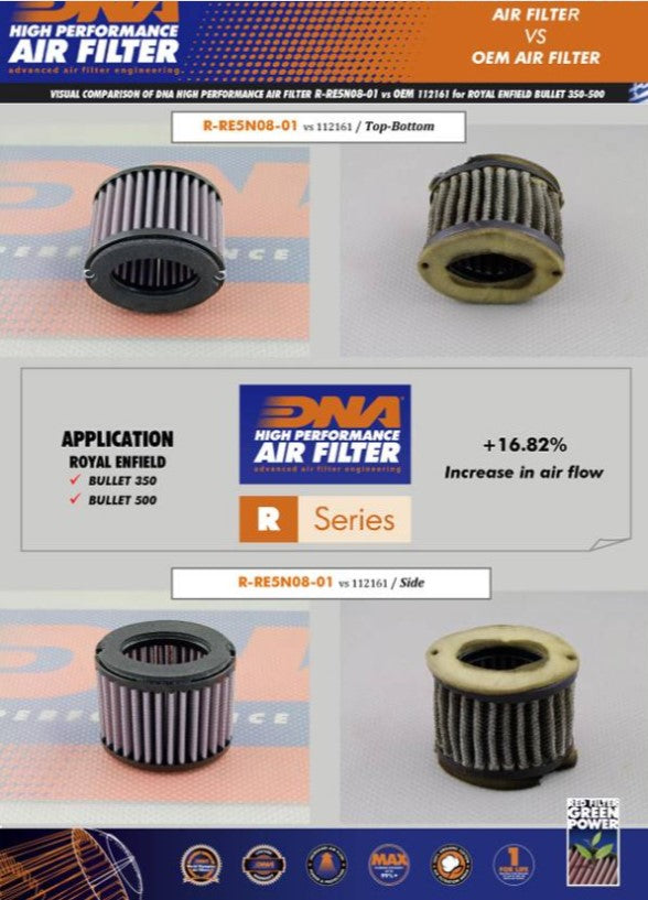 - The flow of this DNA filter set is 16.82% more than the Royal Enfield stock paper filter.