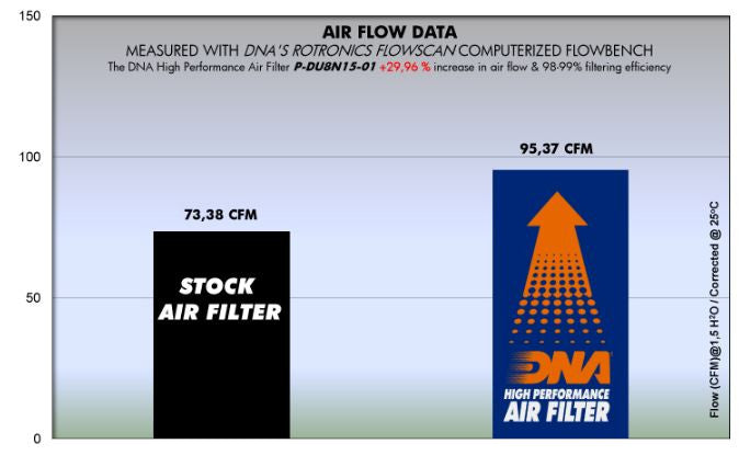 DNA air filter flow: 95.37 CFM(Cubic feet per minute)@1,5"H2O corrected @ 25degrees Celsius