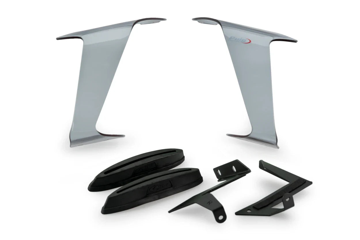 They are made up of two elements: supports injected in flexible plastic that adapt perfectly to the fairing of your motorcycle by means of a 3M dual lock adhesive, strong, resistant and durable, but that can be removed and does not damage or require holes in your fairing. And the second element is a closed-shaped spoiler, which is made of 4mm high-impact acrylic material following safety regulations, with rounded edges with a radius> 2mm, a material of great rigidity and lightness, perfect for receiving aerodynamic pressure and directly translating it into downforce.