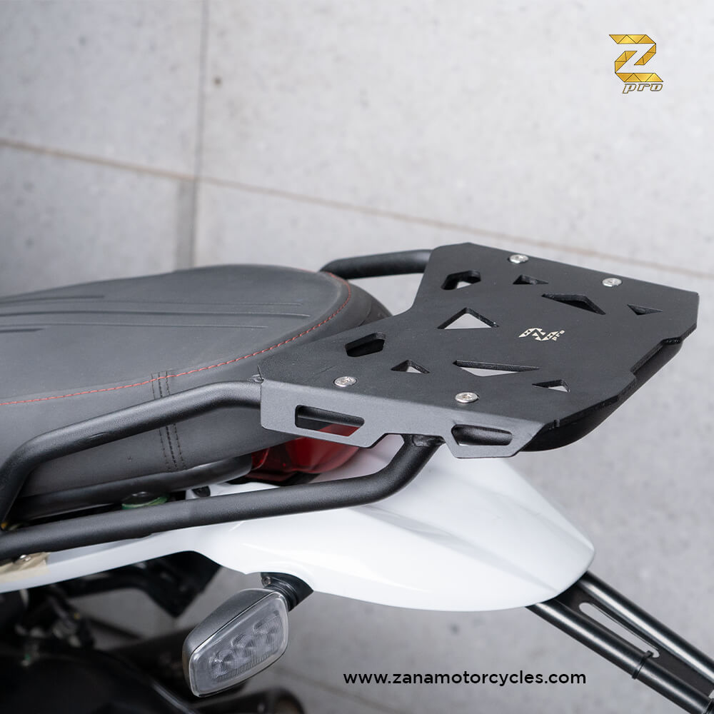 Patent Design exclusively available from ZANA MOTORCYCLES. Lightweight 100% aluminium tray to mount the top box.(NEW PLATE DESIGN) Laser cut for precision and aesthetics. Aluminum tray is available in matt black finish .Size of the aluminium tray approx. 225mm x 235mm. Thickness 4 mm for full strength. Proper weight distribution and mounting using 4mm under seat plate. Cold Rolled Powder Coated Steel Tubes used for manufacturing. Precision Welding (Tungsten Inert Gas Welding) for uniform finish and strength. 6 Months Paint/Powder Coating warranty (not against accidental). Warranty will be void in case of any modifications.