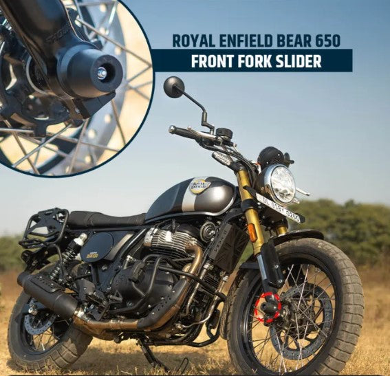 Upgrade your Royal Enfield Bear 650 with the Front Fork Slider for superior protection and peace of mind on every ride. Its durable construction and well-thought-out design ensure your bike stays safe from falls and impacts.