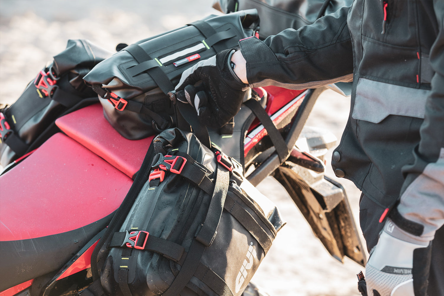 The bag can be attached to a motorcycle saddle, the front mud-guard or combined with / or as an extra compartment of the side rucksacks GRT718