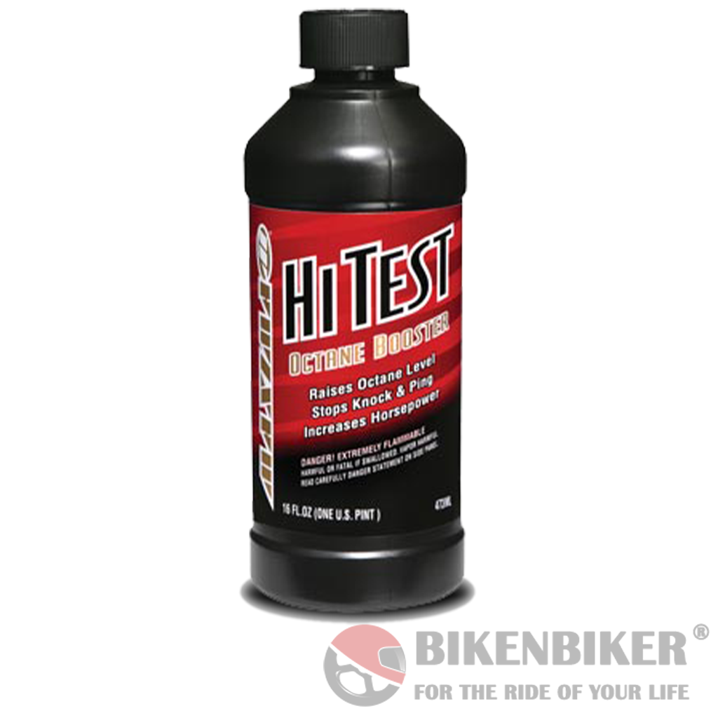 MAXIMA HI-TEST is a concentrated octane booster legal for all types of competition. Hi-Test is an all organic product containing no metal (lead, manganese or phosphorus) compounds. It readily mixes with all types of gasoline as well as alcohol and nitro mixtures. Hi-Test will suppress detonation and pre-ignition by modifying the burn rate and increasing the auto-ignition temperature of the air/fuel mixture. The use of Hi-Test in your gasoline will eliminate “pinging” and “knocking” and the potentially destructive results of them. It will allow for higher compression ratios and therefore more horsepower. Hi-Test should be used in concentrations of one to four ounces per gallon of gasoline. One ounce per gallon raises the effective octane number approximately four points, depending on the base gasoline octane. For racing, very high compression engines, or very low-quality fuel, higher concentrations of Hi-Test may be required.