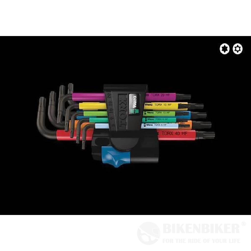 High quality L-keys for recessed TORX® screws. Comes with a holding function: the wedging forces resulting from the contact pressure between the drive tip and the screw profile securely hold the screws on the tool at both ends. The BlackLaser surface treatment provides outstanding corrosion protection and a long service life. "Take it easy" Tool Finder with colour coding according to size. Available in a practical clip fastener, whose wear-free material provides secure storage for the L-keys and enables simple removal.Feature: