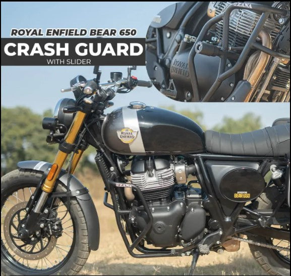 Zana Leg Guard with Slider for the Royal Enfield Bear 650 is a premium accessory designed to protect your motorcycle during both on-road and off-road adventures. Crafted from high-grade mild steel, this crash guard ensures reliable protection for critical components of your bike, shielding it from falls, collisions, and unexpected obstacles.