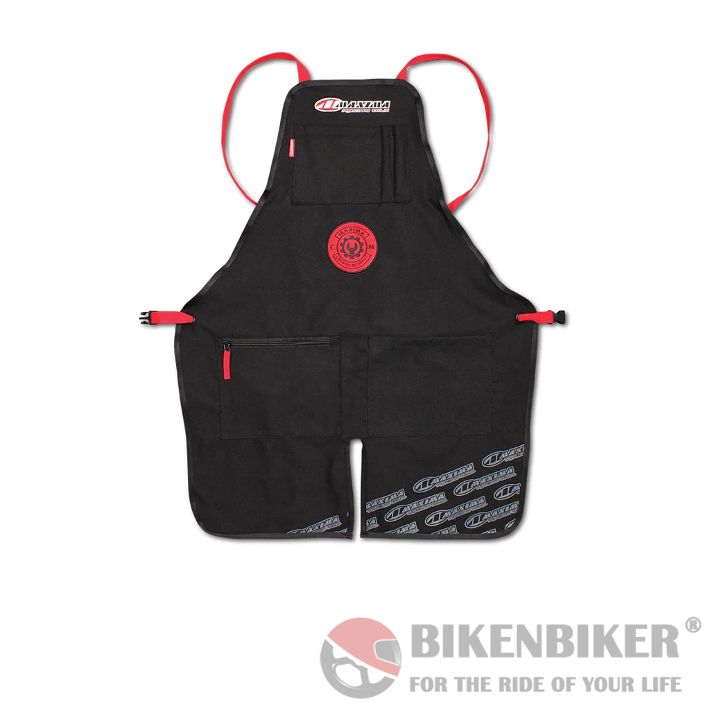A large mid-chest pocket with pen holders, one large zippered waist pocket, and one large open top waist pocket Split lower design provides coverage but improves mobility and flexibility while working Stylish black and red design with Maxima logo on the chest, Maxima Certified patch in center and repeating Maxima print on the lower portion