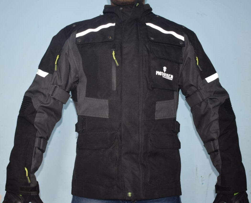 Upper Back for adequate ventilation. - Reflective strips on upper chest for high visibility when the Upper Chest vents are closed. - Bright and Classy looking MotoTech branded and buttons throughout the jacket. - Reflective cord attached with classy looking MotoTech branded pullers throughout the jacket. - Heavy Duty SBS Main front two-sided zipper. To accommodate frock up phenomena while on the bike. - Stretch panels at elbow for easy full range movement. - Standard MotoTech Jacket-to-pant zipper panel. - Reflective MotoTech branding on Front flap pocket and back for high visibility in night / dark conditions. - Reflective "TourPro" series branding on upper arms for high visibility in night / dark conditions.