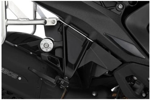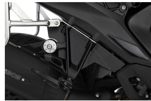 The two passenger splash guards for the right and left side are tailor-made. They close the two side openings of the frame tail precisely in the area of the passenger footrests. Dirt, stone chips, splashed water, or spray thrown up by the rear wheel are effectively captured or internally diverted before reaching the passenger. At the same time, machine contamination is noticeably reduced. The dynamically designed cutout remains discreet and, in combination with the textured coating on the motorcycle, appears unobtrusive and harmonious.