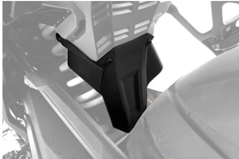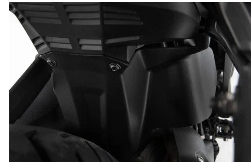 This inner mudguard protects the shock absorber, shock absorber mount, swingarm, and collector. It captures and reliably redirects splashed water. This useful component reduces and protects riders and passengers from spray and road dirt in the foot and shin area.