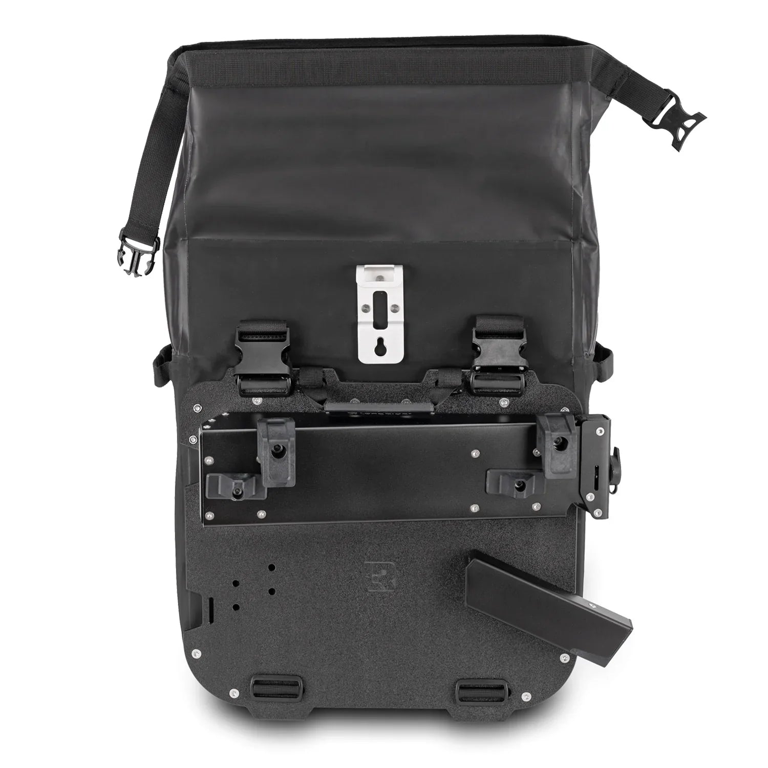 The Rackless Rackless MotoBags have a smooth and simple-to-use connection system that utilizes the same attachment points as BMW's Vario system.