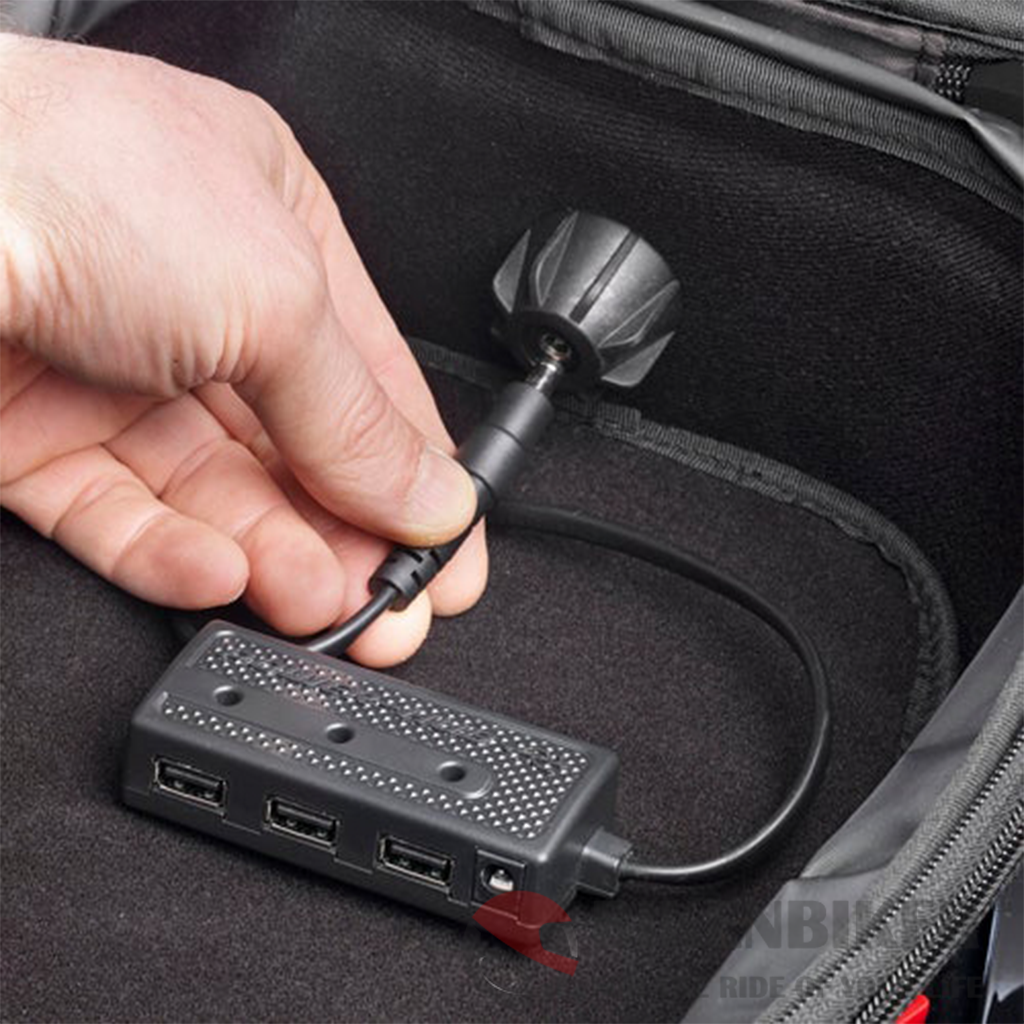 Hub kit for the electrical feed for tank bags. It supplies three devices through the USB ports and a fourth device with the ISO 12v Internal Power connector.