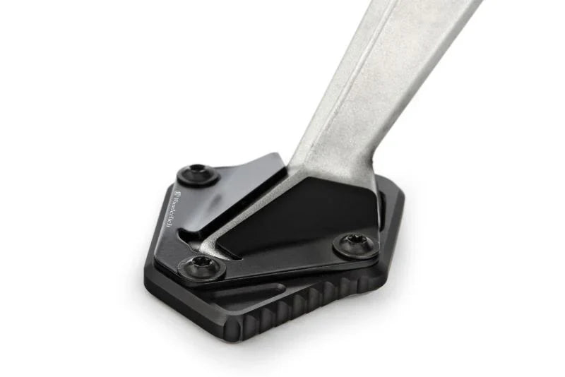 - The two-part side stand enlarger ensures the secure stand of your motorcycle on any terrain – even on hot asphalt or soft ground – especially with a fully loaded bike