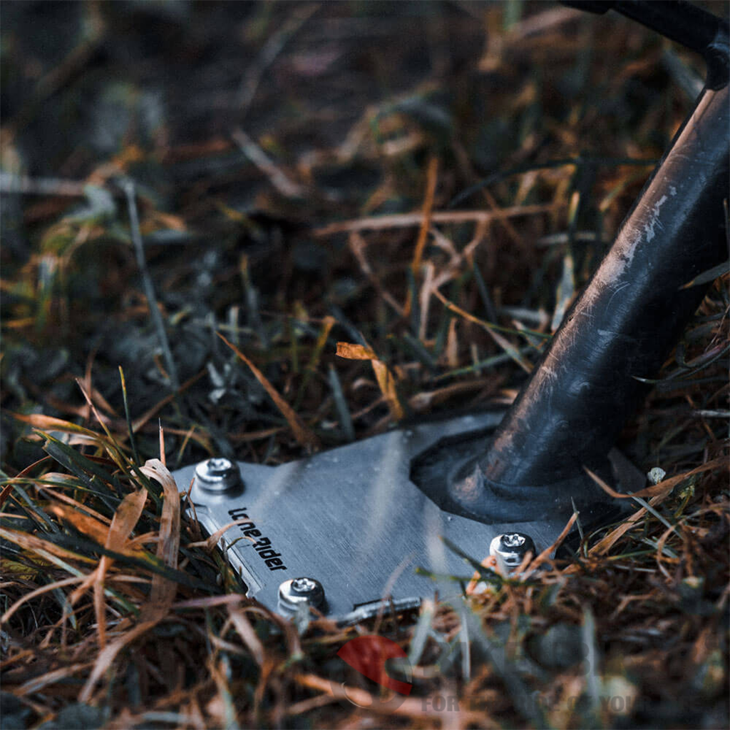 The Lone Rider MotoArmor Side Stand Extension design has been engineered to give your bike the best footing possible on soft or loose ground.