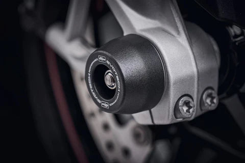 Produced from injection-moulded matt black nylon, EP Spindle Bobbins for the BMW S 1000 R offer robust crash protection. With the additional support from the aluminium inner, the spindle bobbins aim to be the first to take impact in an incident and hold the expensive front forks, brake calipers and rear swingarm away from harm. The innovative EP design allows the nylon bobbins to rotate above the aluminium to decrease wear and stress on the wheel.