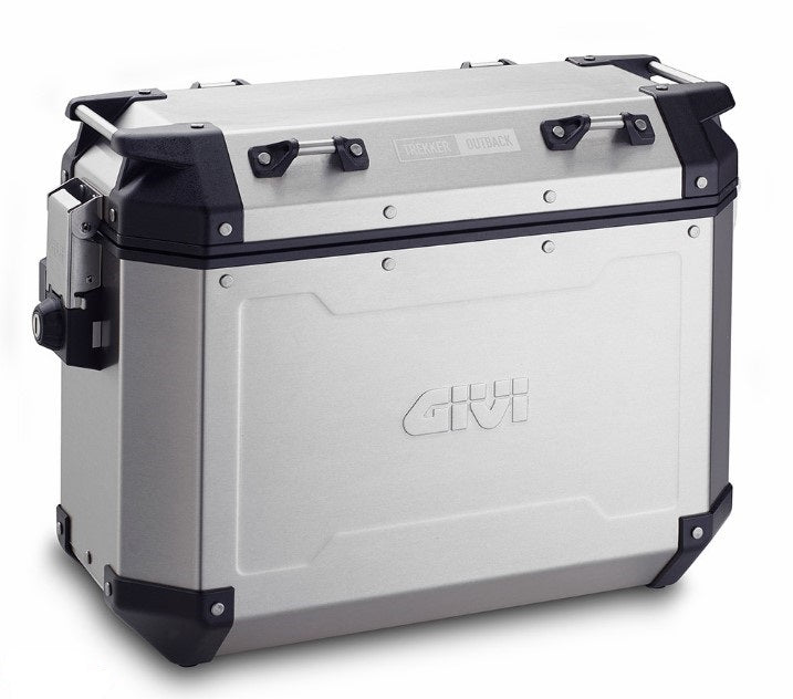 Trekker Outback side-case, with aluminium structure and profiles. Available in two different sizes: 37 ltr and 48 ltr. Equipped with the MONOKEY® CAM-SIDE fitting system in die-cast aluminium and inserts in reinforced technopolymer.