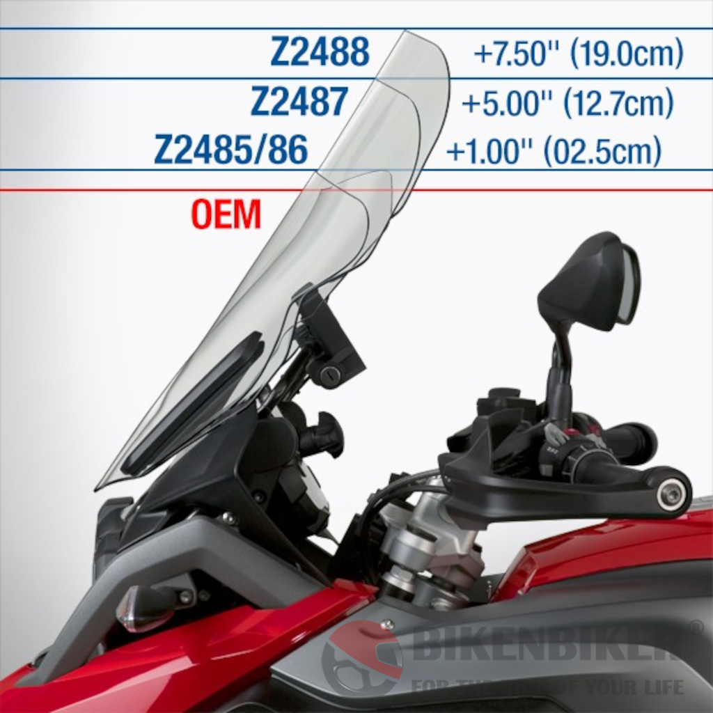 ZTechnik's VStream® Windscreens for the BMW R1200GS/LC come in three sizes. The Z2485 Dark Tint and Z2486 Clear Sport screens are reshaped in VStream's distinctive contour but similar in height to the OEM windscreen. The Z2487 Touring VStream is wider and taller than stock for superb touring performance. The Z2488 Touring Deluxe is for maximum wind protection for the serious long distance rider.