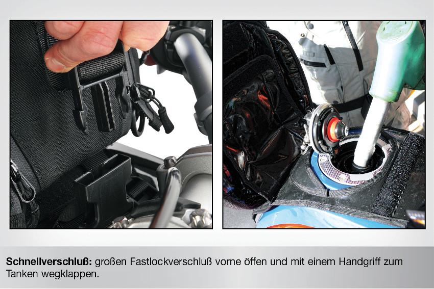 This new tank bag features a solid base which is first attached to the tank. The tank bag is then quickly and easily attached to the base plate by means of a tab that fits into the base plate. Removal is just as simple and for those bikes where the “tank” is really a tank, we have designed an easy access flap to the filler, so that the base can remain in place.
